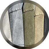 Hand-tie/dyeing, silicone wash, snow wash, and garment dyeing. Giving garments a unique distressed soul and vintage hues.