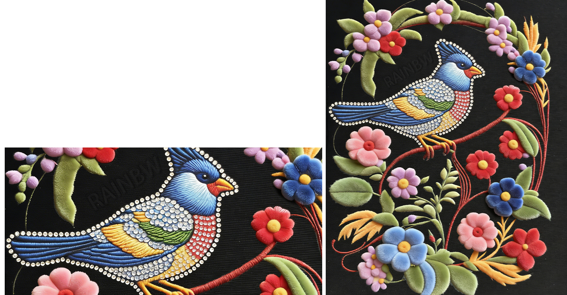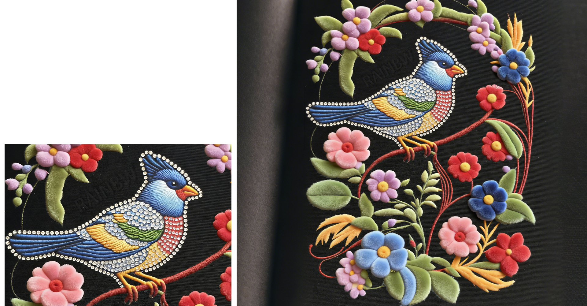 The repeated "RAINBOW TOUCHES" logo boosts brand recognition while continuing the "branded, symbolic" high-luxury design language of vintage pieces.