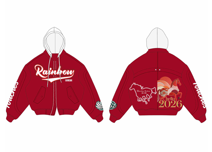 The jacket body uses spray-print craft for a unique, smooth texture, elevating the basic silhouette with subtle flair; sharp silk-screen logos adorn the front and sleeves, while the back’s colorful direct-printed logo (paired with Year of the Horse elements) has vivid layers—all details exude luxury quality.