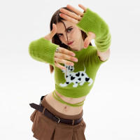 Custom Women's Knit Crop Top| Imitation Mink Hair Puppy Pattern Trendy Casual Short Sleeve Raglan Sleeve Top