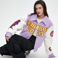 Chic meets playful! This lavender-white varsity bomber jacket features bold "RAINBOW 2013" embroidery and sleeve patches. Wool-blend comfort, faux-leather sleeves, and vibrant accents.