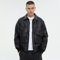 Edgy dark PU leather bomber jacket with 3D pockets and leather patches. Crafted from 100% polyester for durability. Ideal for street fashion brands and B2B wholesale. Customizable options available.
