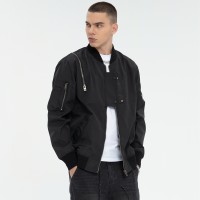 Edgy bomber jacket with zipper accents, made from 100% polyester nylon fabric. Perfect for street fashion brands and B2B wholesale. Customizable zipper placements and bulk order options.