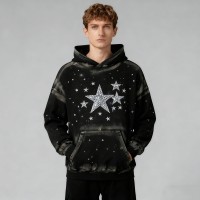 Men’s 100% cotton hoodie featuring a celestial-inspired starry night design with sparkling rhinestones and spray-mottled wash. Ideal for B2B streetwear brands seeking bold, customizable styles.