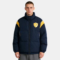 Stay warm in style with this navy puffer jacket. Features towel embroidery, patchwork, and number print. Ideal winter outerwear.