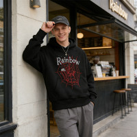 98% cotton and 2% Spandex hoodie with rhinestone"Rainbow" details. Step into the dark side with our Rainbow Spider Web Hoodie! Rhinestone-embellished gothic style for a bold streetwear look.
