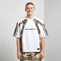 Tree camo sublimation and print color block tee, oversized fit, cotton blend. Bold streetwear style, customisable for OEM brands.