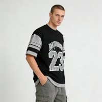 Waffle knit T-shirt with screen print graphics and embroidery patch. Black-grey color block streetwear for retro sporty casual style.