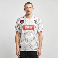 Camouflage sublimation polo with raised rubber print and embroidered patches. Mesh streetwear for bold retro military-inspired looks.