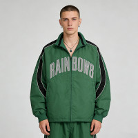 Waterproof nylon patchwork jacket with "RAINBOW8" embroidery, perfect for streetwear. Custom manufacturing supported.