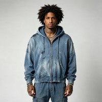 Washed distressed splash ink zip hoodie, vintage faded and ripped cotton fleece for streetwear, custom OEM available.