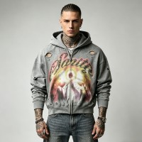 Vintage washed zip-up hoodie with rips, rhinestones, and digital print. Premium cotton for edgy streetwear style.